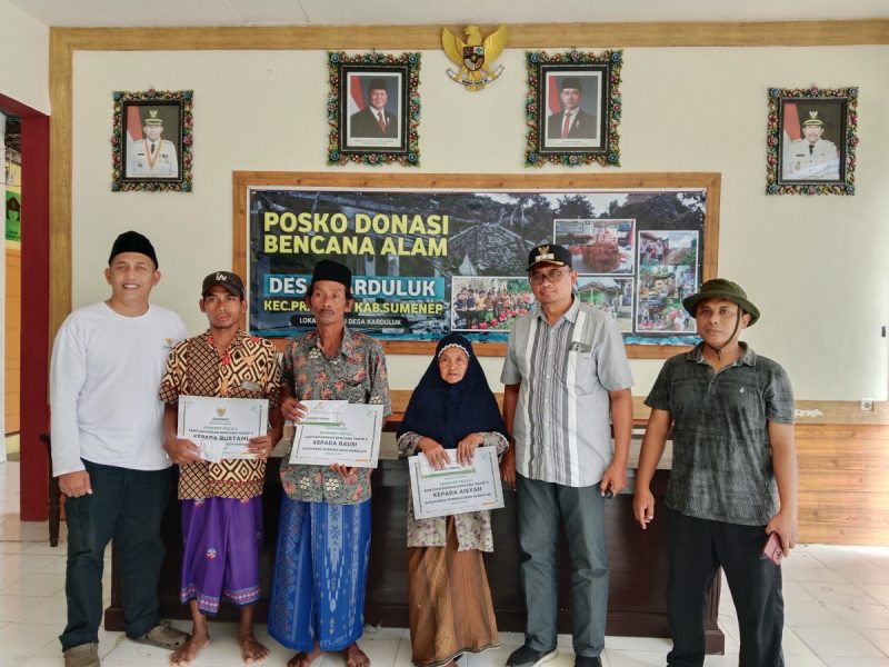 Penyerahan bantuan dilakukan secara langsung oleh Wakil Ketua I BAZNAS Sumenep, H. Sugeng Haryadi, S.T., bersama Camat Pragaan Indra Hermawan, S.Sos., M.M. dan Kepala Desa Karduluk Ahmad Faruq.