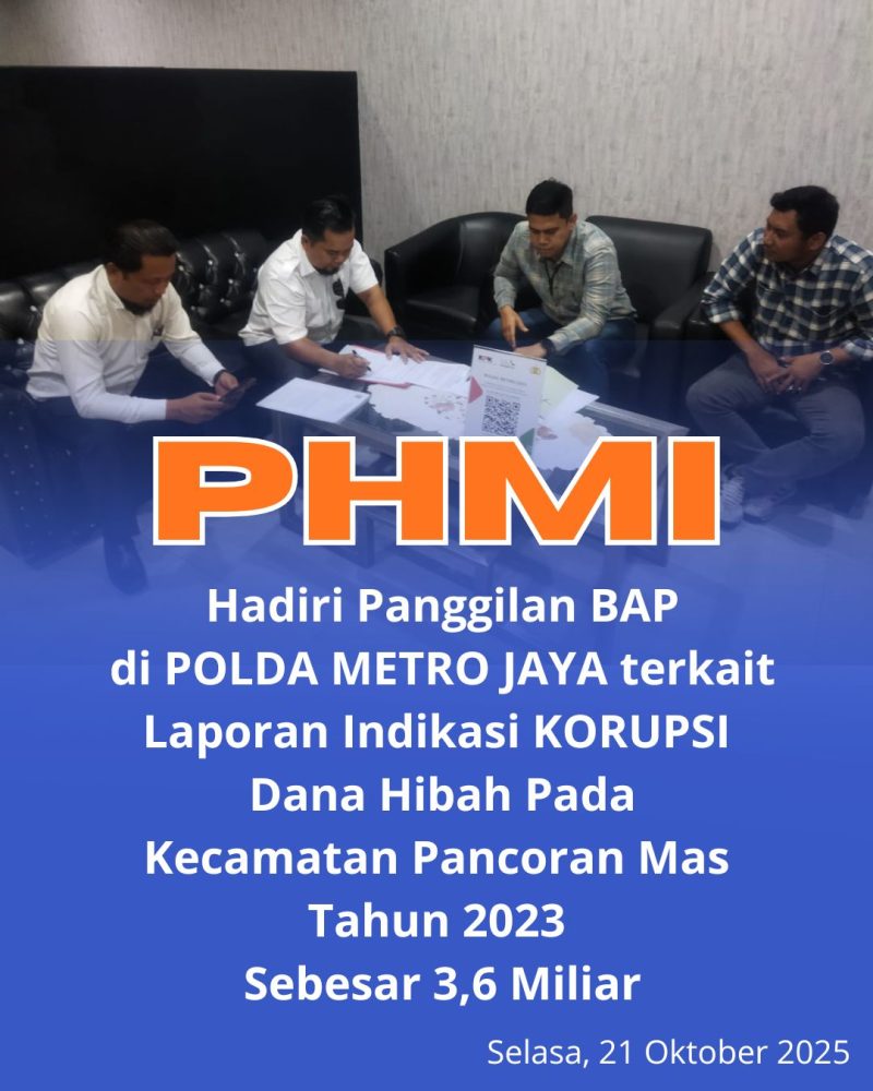 Depok – Selasa 21 Oktober 2025, Perisai Hukum Masyarakat Indonesia (PHMI) mengahadiri Pemeriksaan terkait laporan yang dibuat PHMI yaitu mengenai Belanja Hibah sebesar Rp. 3.608.825.000 pada Polda Metrojaya.