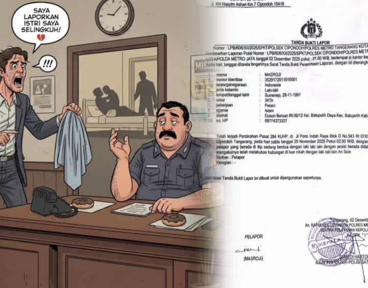 Tangerang, 7 Desember 2025 – Seorang pria bernama Masroji resmi melaporkan dugaan tindak pidana perzinahan sebagaimana diatur dalam Pasal 284 KUHP ke Polsek Cipondoh, Polres Metro Tangerang Kota, Polda Metro Jaya. Laporan tersebut teregister dengan nomor LP/608/XII/2025/SPKT/POLSEK CIPONDOH/POLRES METRO TANGERANG KOTA/POLDA METRO JAYA, tertanggal 2 Desember 2025.